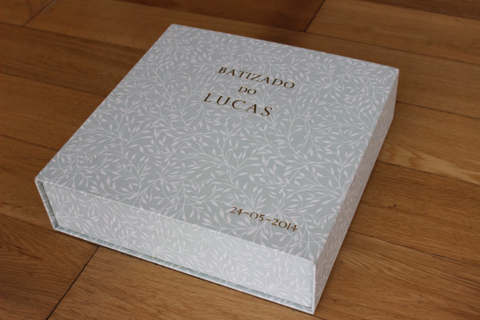 Queria uma peça marcante, qualquer coisa que simbolizasse aquele dia e que ficasse para sempre. Ainda pensei numa pintura, mas de repente lembrei-me, e porque não uma caixa para colocar a vela, a roupa, o álbum de fotografias? Tudo resumido numa caixa, mas teria que ser "a" caixa, pensada e idealizada por mim. Queria um determinado tecido, gostava de uma gravação a ouro e depois de muito pensar aconteceu isto!